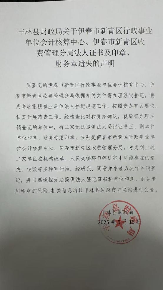 豐林縣財政局關(guān)于伊春市新青區(qū)行政事業(yè)單位會計核算中心、伊春市新青區(qū)收費管理分局法人證書及印章、財務(wù)章遺失的聲明