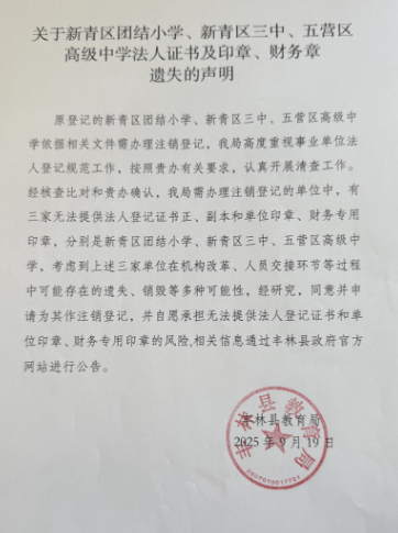 關于新青區團結小學、新青區三中、五營區高級中學法人證書及印章、財務章遺失的聲明