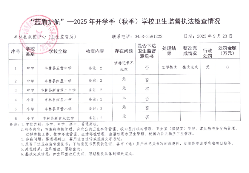 藍盾護航”—2025年開學季(秋季)學校衛生監督執法檢查情況